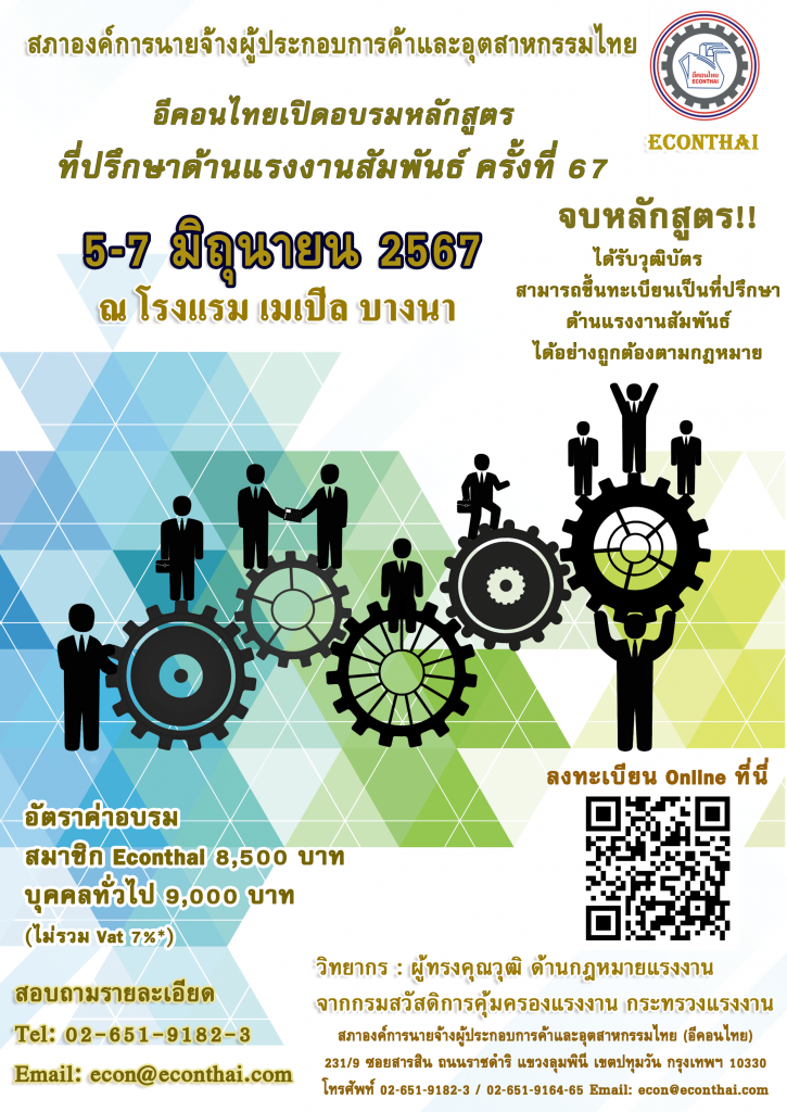 ขอเชิญเข้าร่วมการอบรมหลักสูตรที่ปรึกษาด้านแรงงานสัมพันธ์ ครั้งที่ 67