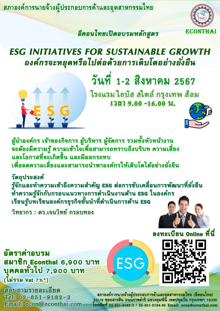 เป็นเรื่องสำคัญ ที่ทุกธุรกิจต้องบูรณาการและขับเคลื่อนอย่างเป็นรูปธรรม ธุรกิจต้องปรับตัวและพัฒนาตนเองอยู่เสมอ ให้สามารถอยู่รอดและเติบโตได้อย่างมั่นคงและยั่งยืน เพื่อลดความเสี่ยงของธุรกิจ และได้การยอมรับในระดับสากล หลักสูตร ESG องค์กรจะหยุด หรือ ไปต่อด้วยความยั่งยืน ” จะทำให้ท่านเข้าใจความรู้ จัดเต็ม 2 วัน