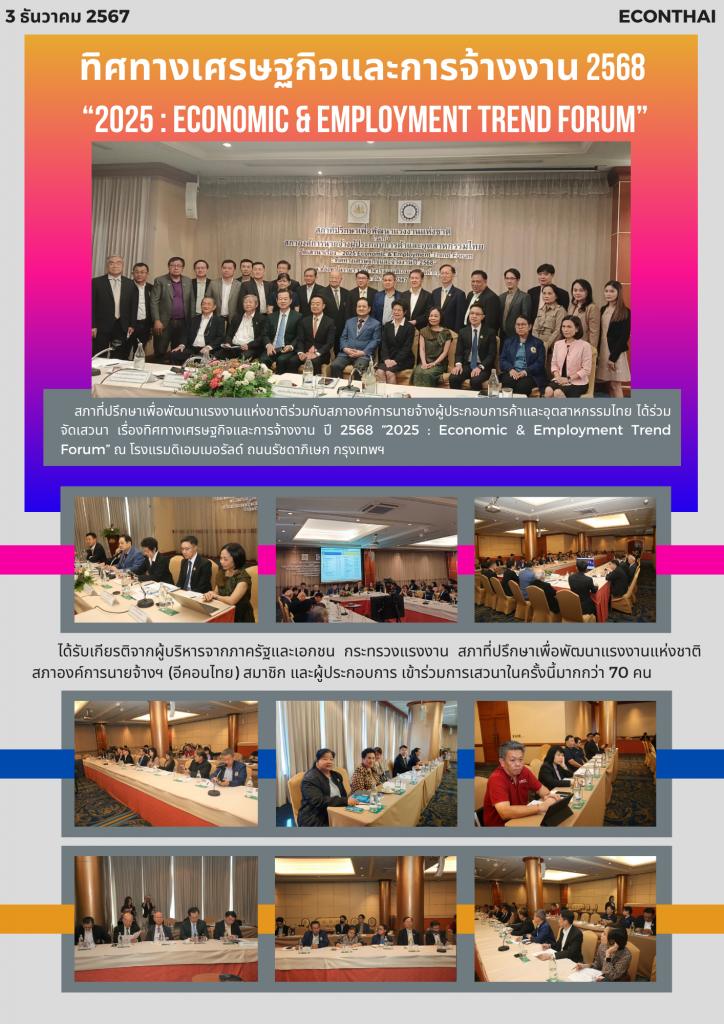 โดยมี ดร.เนาวรัตน์ ทรงสวัสดิ์ชัย ประธานสภาองค์การนายจ้างผู้ประกอบการค้าและอุตสาหกรรมไทย (อีคอนไทย) ให้เกียรติกล่าวเปิดงาน และได้รับเกียรติจาก ดร.ธนิต โสรัตน์ รองประธานสภาองค์การนายจ้างผู้ประกอบการค้าและอุตสาหกรรมไทยด้านเศรษฐกิจและนายสุวรรณ สุขประเสริฐ รองประธานสภาองค์การนายจ้างผู้ประกอบการค้าและอุตสาหกรรมไทยด้านกฎหมายและบริหารร่วมบรรยายในงาน ทางอีคอนไทยขอขอบพระคุณผู้เข้าเสวนาทุกท่านมา ณ ที่นี่ด้วยค่ะ