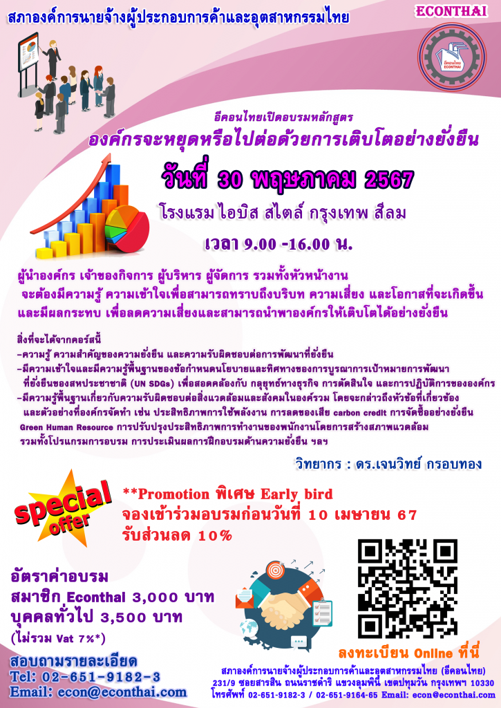 สมาชิกอีคอนไทย และท่านผู้สนใจที่สำรองที่นั่ง ผ่านสภาฯ จะได้รับส่วนลดพิเศษ 5 % จากค่าสัมมนา